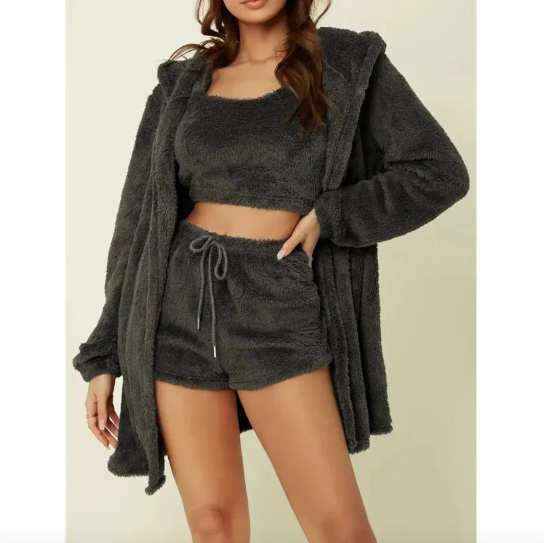 Stay cozy and stylish with this 3-piece winter set, featuring a hooded jacket, plush pants, and a warm inner layer. Made with thickened, double-sided plush fabric, this solid-color set offers exceptional warmth and comfort for chilly days. Perfect for lounging at home or casual outings, it’s a must-have for your winter wardrobe.
